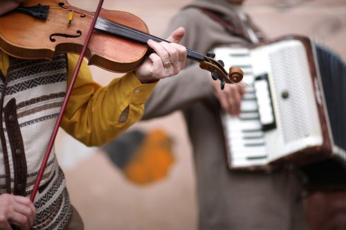 Music band performance; hands of violincellist in focus