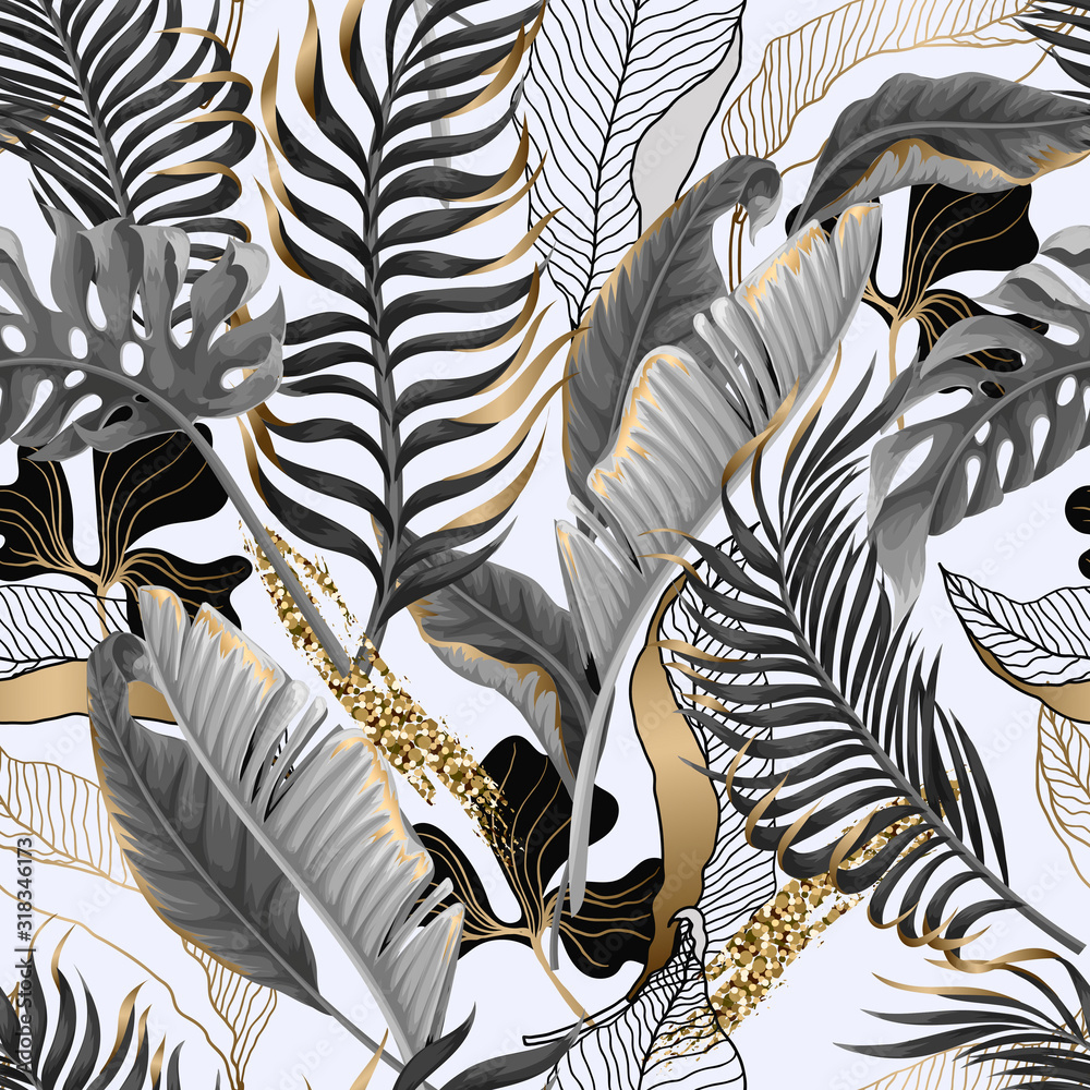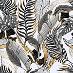 Seamless pattern with black and white tropical leaves and golden eleme...